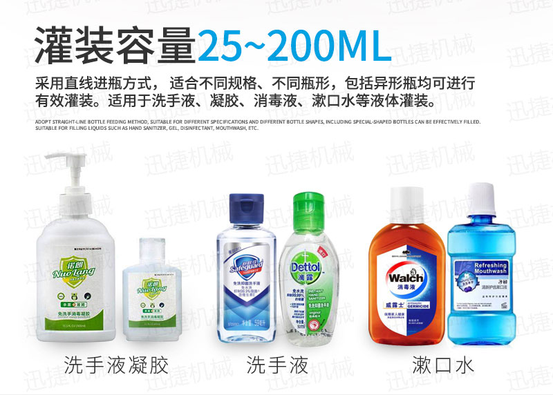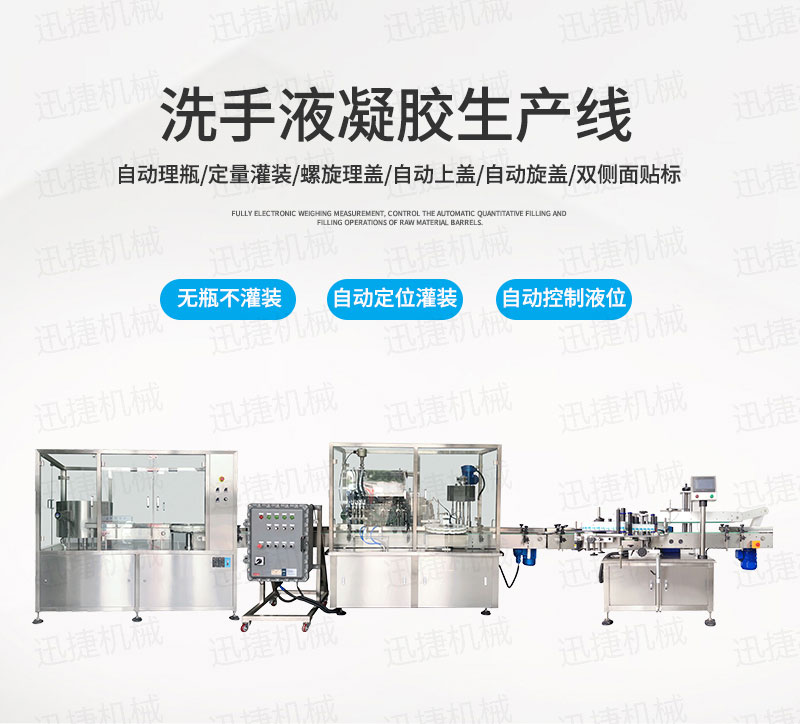 全自動凝膠生產線適用于消毒凝膠、免洗手洗手液、免洗手消毒凝膠、消毒液、84消毒液、醫用酒精、75%酒精消毒液、75度酒精、消毒水、殺菌消毒劑、醫用酒精、碘酒、過氧乙酸、次氯酸鈉、劑、醫用乙醇消毒液、瓶裝消毒劑等產品,有多頭全自動消毒液灌裝機和封箱機、貼標機、打包機、噴碼機等配套設備組成,實現消毒液自動灌裝,自動旋蓋,自動貼標,從灌裝、到成品的全部過程