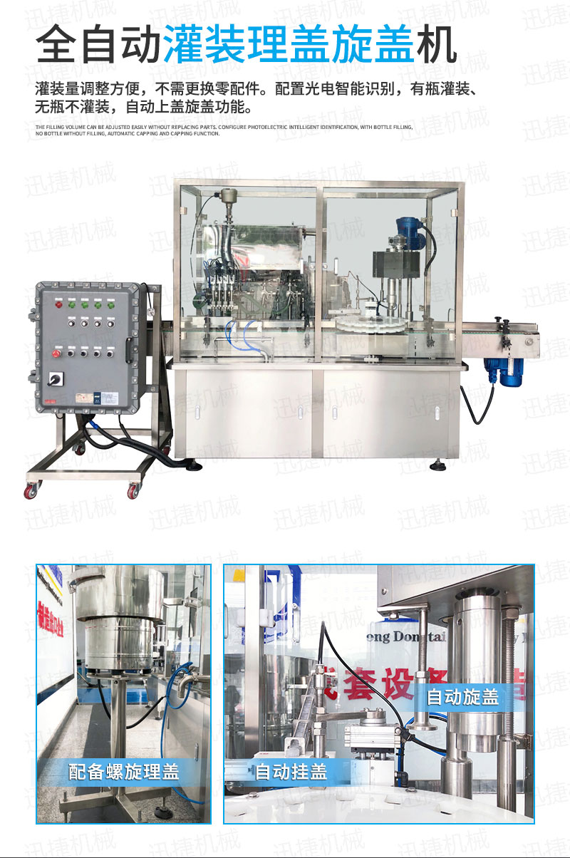 消毒液洗手液灌裝生產線集光、電、氣于一體,由PLC配合人機界面(觸摸屏)控制,搭配生產線使用,從進瓶、定位、灌裝、出瓶等動作均全自動完成。采用直流式灌裝,與物料接觸部分均采用出色不銹鋼和食品級材料制成,符合食品衛生要求,,迅捷機械是一家專業的自動化灌裝生產線、灌裝流水線、免洗手 消毒液灌裝機生產線可根據實際需求定制4頭、6、8、10、12、14、16頭,生產效率高、速度快,省人省力。